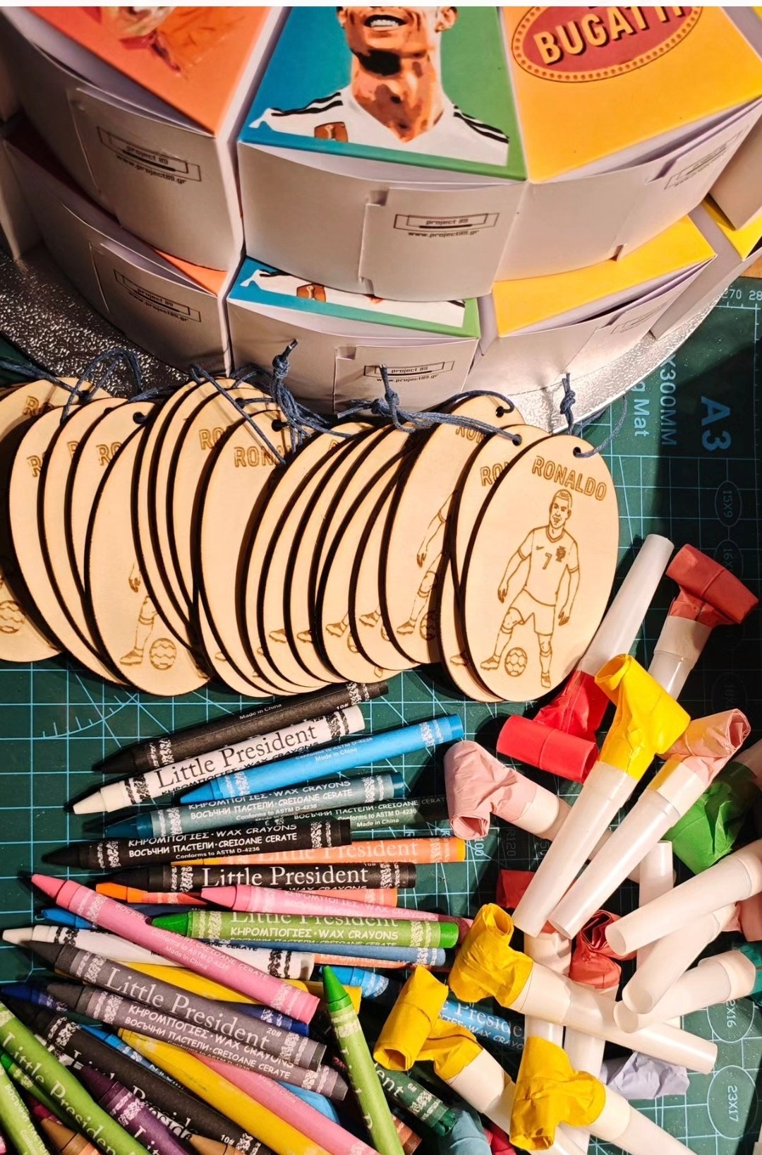 Επιλογή 5: 1 ξύλινο μπρελόκ με όνομα, 1 Χρωμοσελίδα  (10 εκατοστά στο θέμα της τούρτας), 2 κηρομπογιές  και 2 καραμέλες.