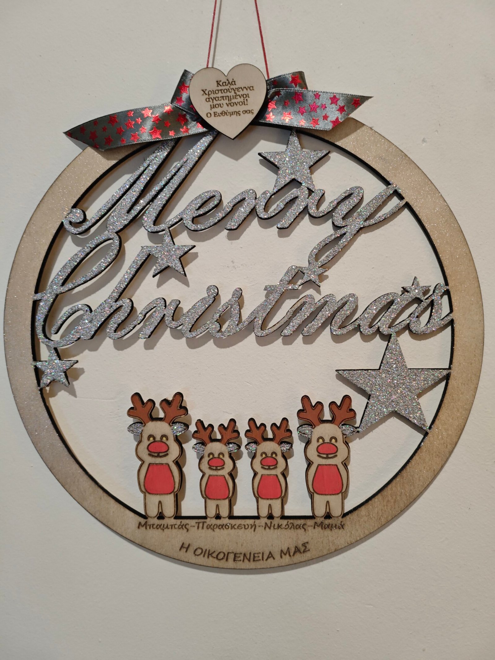 Χειροποίητο ξύλινο  Χριστουγεννιάτικο στεφάνι με τα ονόματα  της επιλογής σας.