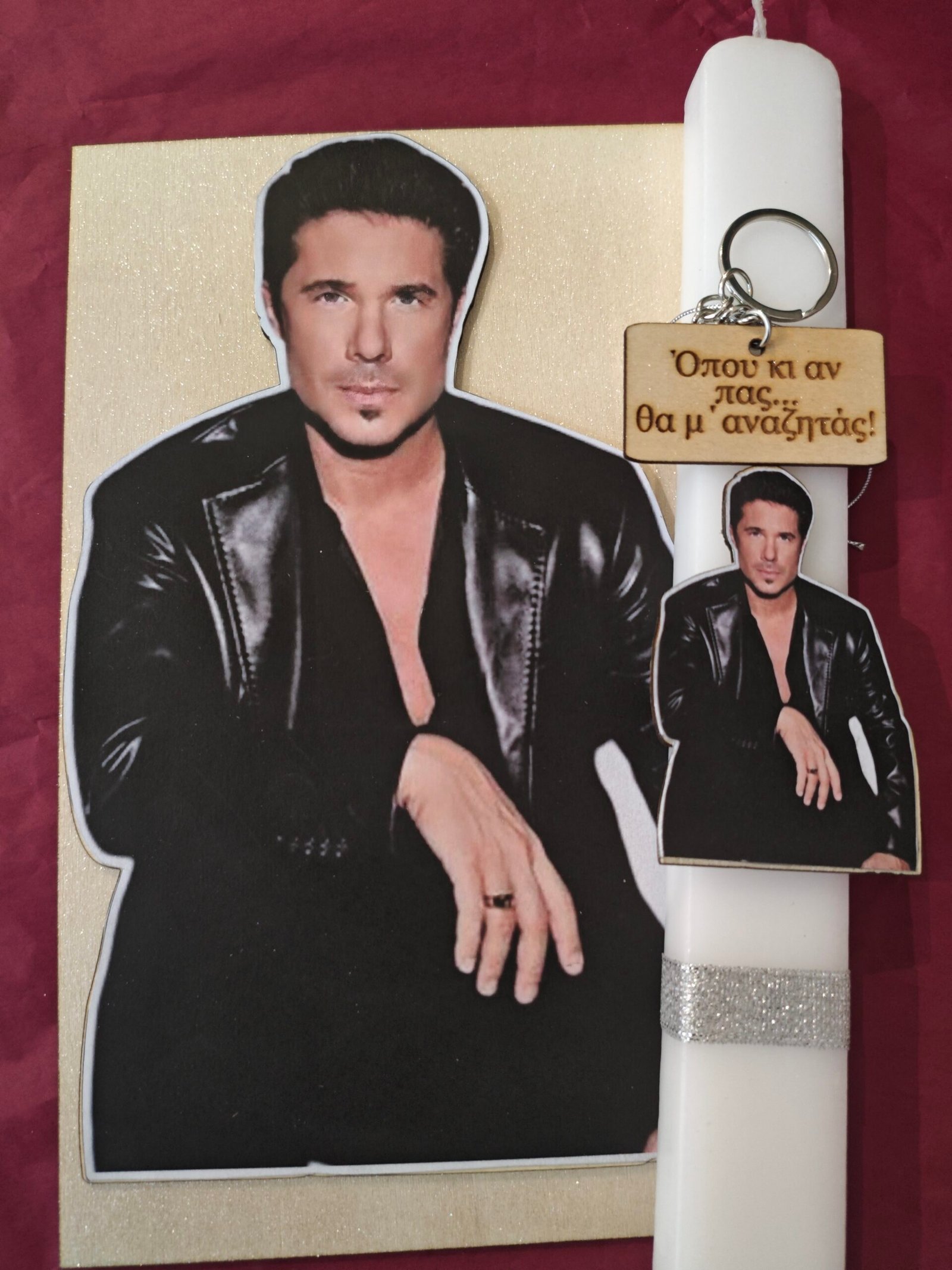 Λαμπάδα “Οικονομόπουλος” με εκτυπωμένη ξύλινη πλάτη και μπρελόκ με στίχο